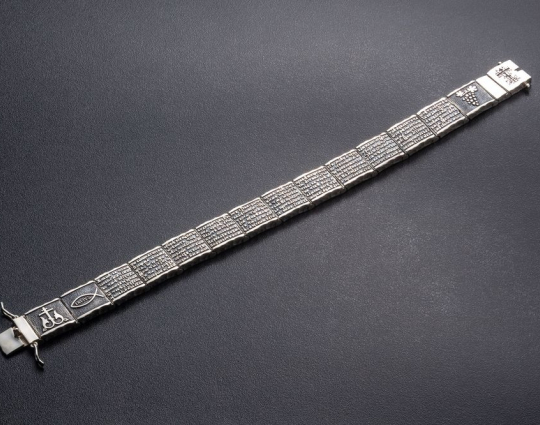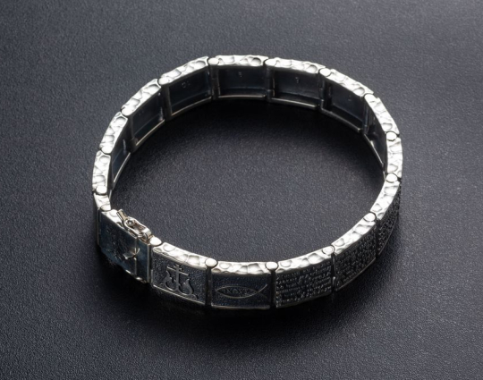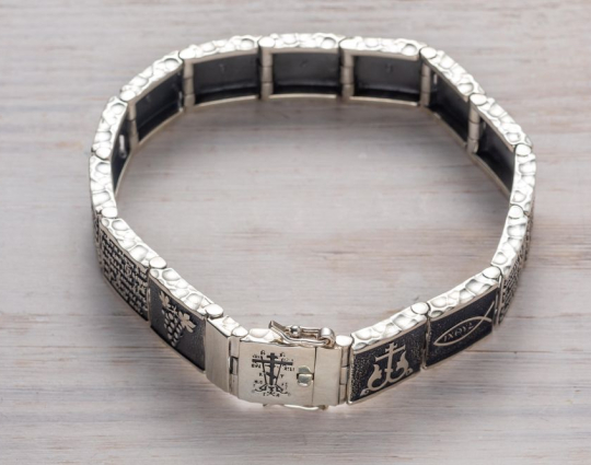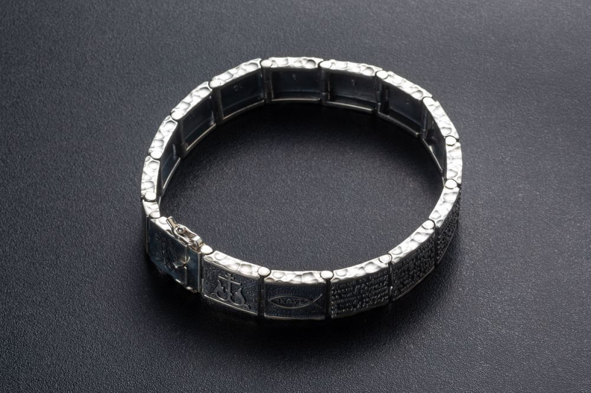 Серебряный браслет, состоящий из звеньев, на которых написаны священные слова. Они взяты из 90-ого Псалома, который как бы построен в форме обращения учителя к своему подопечному или к сыну.  В наставлении говорится о том, что Бог - наш помощник и защитник, к которому можно обращаться в сложных ситуациях. В последних строках вводятся слова Всевышнего, подтверждающие сказанное.