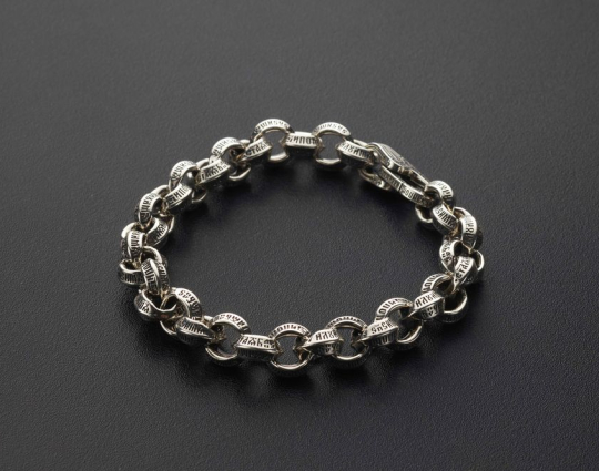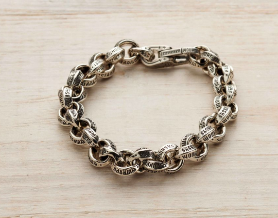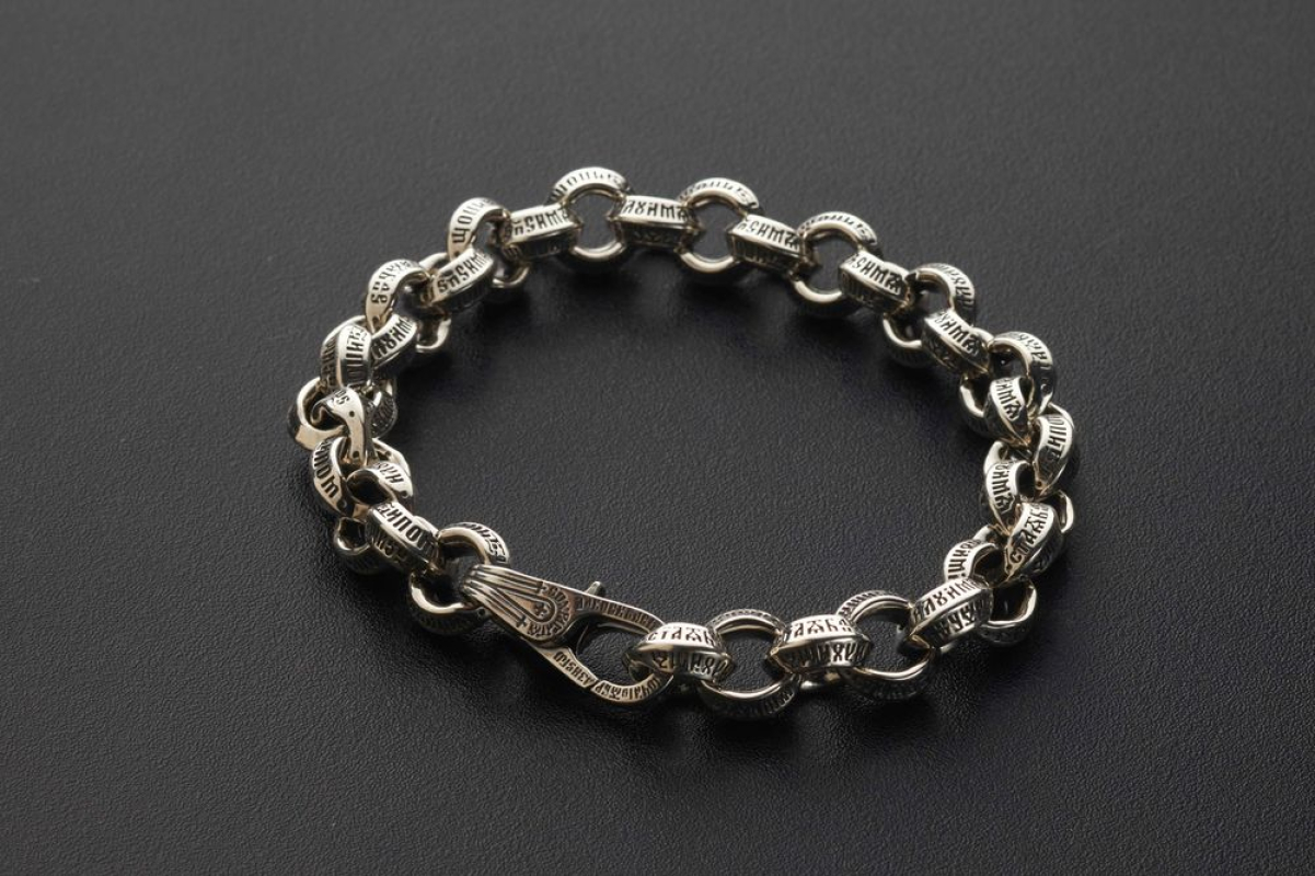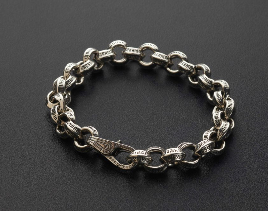 Лаконичный браслет выполнен из серебра с чернением. Плетение «бельцер» с массивным и надежным замком-карабином. На звеньях с двух сторон нанесены молитвы Христу и Богоматери: «Господи, помилуй мя» и «Пресвятая Богородица, спаси мя». Они помогают сосредоточить ум, обратить мысли в правильном направлении, укрепиться в вере.