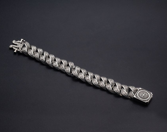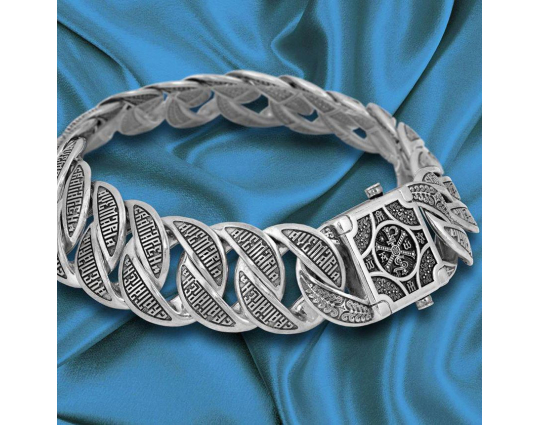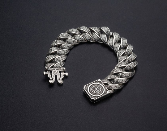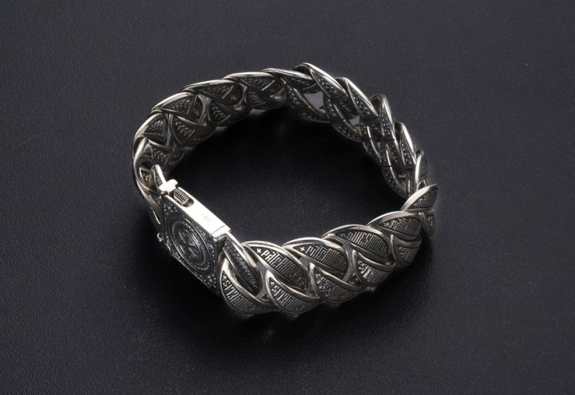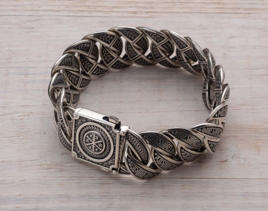 Серебряная застежка на массивном мужском серебряном браслете украшена изображением хризмы. Это монограмма имени Спасителя, которая состоит из скрещенных начальных букв его имени, греческих Х (хи) и Р (ро). Она имеет важный смысл и придает художественной изящности. Слева и справа помещены литеры Альфа и Омега, отсылающие к словам Господа о Себе: «Аз есмь Альфа и Омега, начало и конец, Который есть и был и грядет, Вседержитель» (Откр. 1:8). Хризма в лавровом венке еще в первые века символизировала победу Христа над злом.