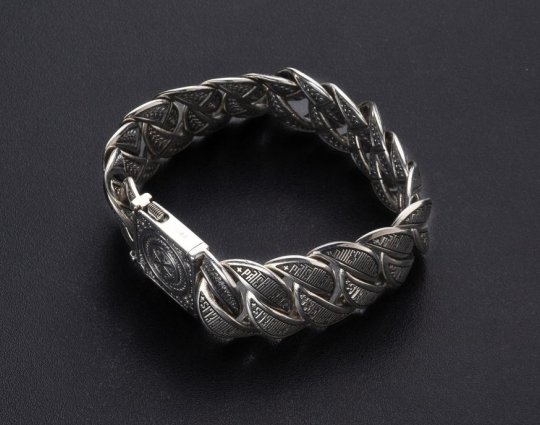 На звеньях браслета из серебра написаны слова из молитвы «Отче наш». Этой молитвой Господь научил апостолов молиться Ему. Слова «Отче наш» написаны на латинском языке: «Pater noster». Оборот звеньев украшают ветви благородного лавра, древа победителей.