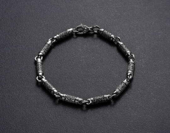 Серебряный браслет, состоящий из звеньев, на которые нанесен византийский орнамент, символизирующий жизнь и процветание .  Сам корпус звена затемнен. На браслет дополнительно нанесен тонкий слой родия. Такое покрытие позволяет защитить изделие от вредных воздействий окружающей среды и сохранить их первозданный блеск.