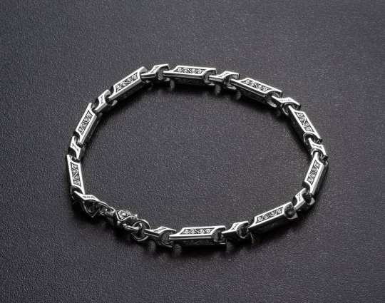 Серебряный браслет, состоящий из звеньев геометрической формы с орнаментом, которые дополнительно покрыты тонким слоем родия. Такое покрытие позволяет защитить изделие от вредных воздействий окружающей среды и сохранить его первозданный блеск.