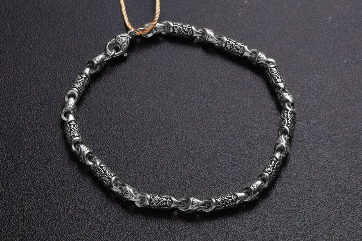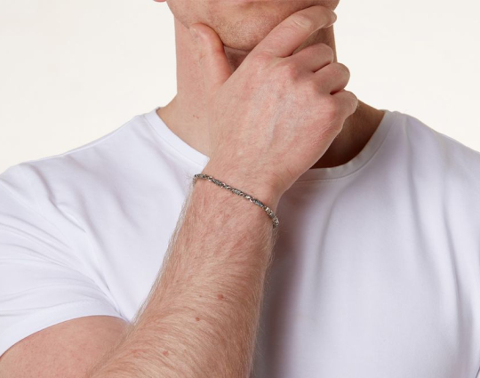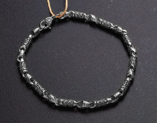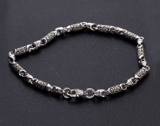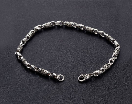 Серебряный браслет с родиевым покрытием, состоящий из звеньев, на которые нанесен изящный византийский орнамент. Сам корпус звена затемнен.