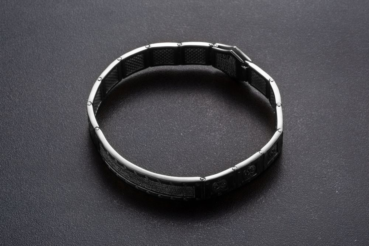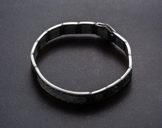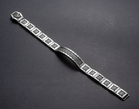 Массивный серебряный браслет с родиевым покрытием, которое позволяет защитить изделие от вредных воздействий окружающей среды и сохранить их первозданный блеск.  На центральном звене браслета написан текст 22 Псалма. Верующие читают его в любой ситуации. Он помогает справиться человеку с трудностями, жизненными неурядицами и проблемами. На остальных звеньях изображена Хризма- древнейший символ Христа. Она составлена из греческих букв, с которых начинается его имя.