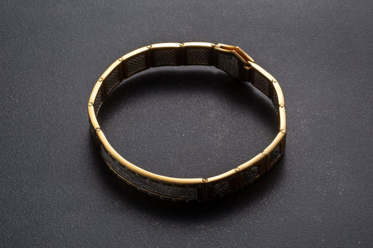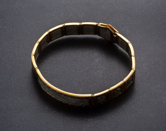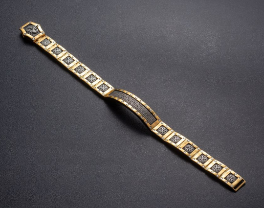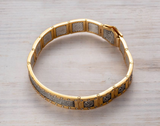 Массивный серебряный браслет позолоченной отделкой.  На центральном звене браслета написан текст 22 Псалма. Верующие читают его в любой ситуации. Он помогает справиться человеку с трудностями, жизненными неурядицами и проблемами. На остальных звеньях изображена Хризма- древнейший символ Христа. Она составлена из греческих букв, с которых начинается его имя.