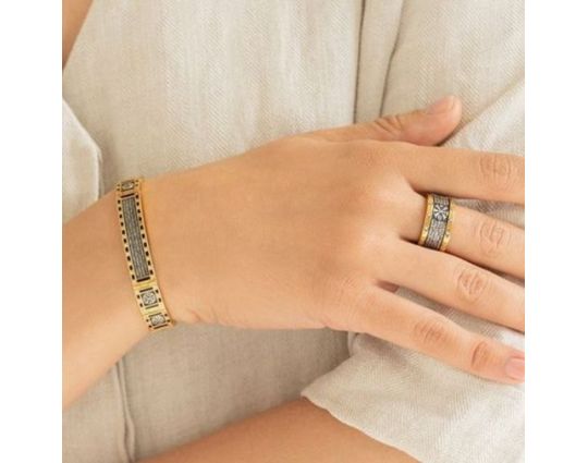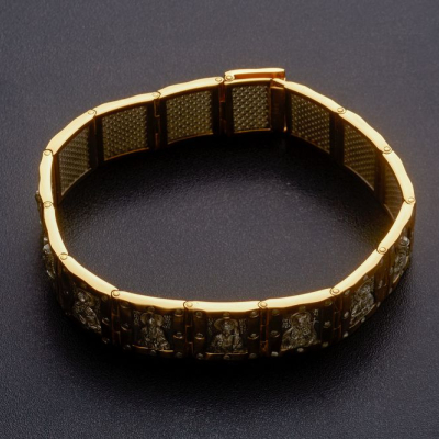 Массивный серебряный браслет позолоченной отделкой, эмалевой росписью и фианитами, вставленными по контуру браслета.  На центральном звене браслета написан текст 22 Псалма. Верующие читают его в любой ситуации. Он помогает справиться человеку с трудностями, жизненными неурядицами и проблемами. На остальных звеньях изображена Хризма- древнейший символ Христа. Она составлена из греческих букв, с которых начинается его имя.