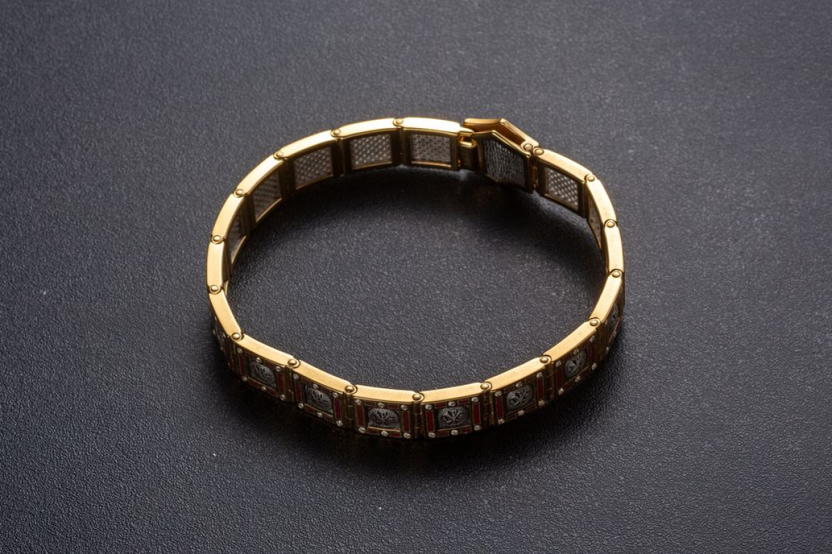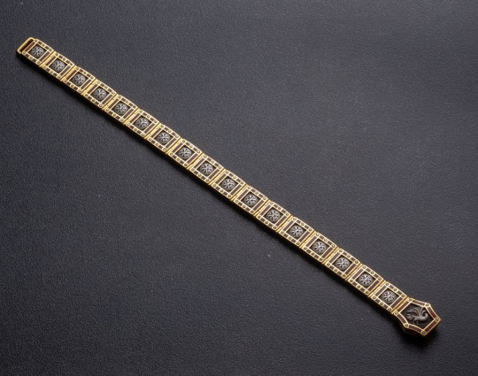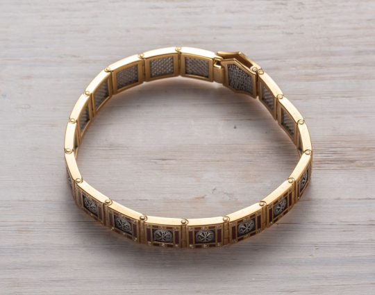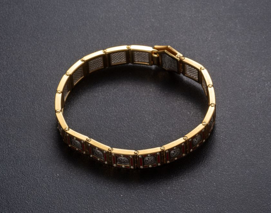 Массивный серебряный браслет позолоченной отделкой, эмалевой росписью и фианитами, вставленными по контуру браслета.  На центральном звене браслета нарисован орел. В православной вере эта птица символизирует нашу душу, которая словно летит к Солнцу и крепнет благодаря духовной работе, молитвам и добрым делам. На остальных звеньях изображена Хризма- древнейший символ Христа. Она составлена из греческих букв, с которых начинается его имя.