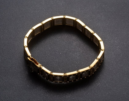 Массивный серебряный браслет позолоченной отделкой, эмалевой росписью и фианитами, вставленными по контуру браслета.  На центральном звене браслета нарисован орел. В православной вере эта птица символизирует нашу душу, которая словно летит к Солнцу и крепнет благодаря духовной работе, молитвам и добрым делам. На остальных звеньях изображена Хризма- древнейший символ Христа. Она составлена из греческих букв, с которых начинается его имя.