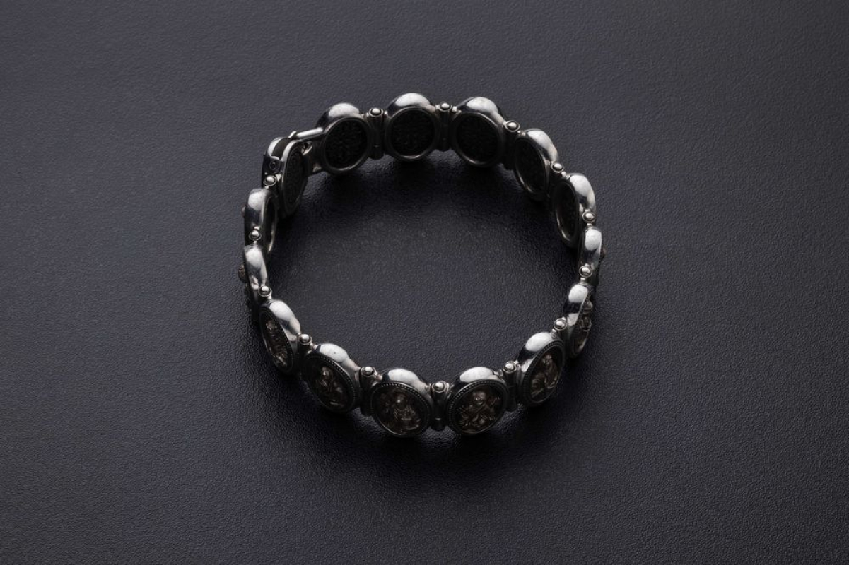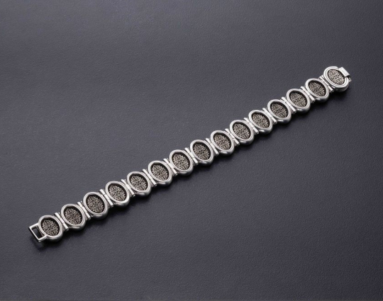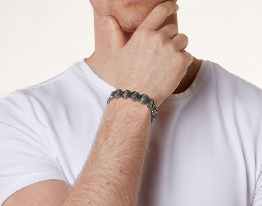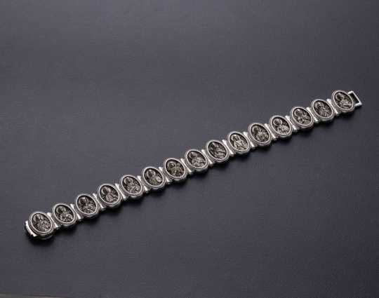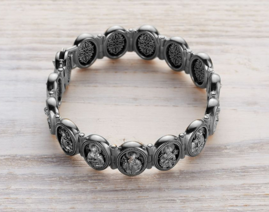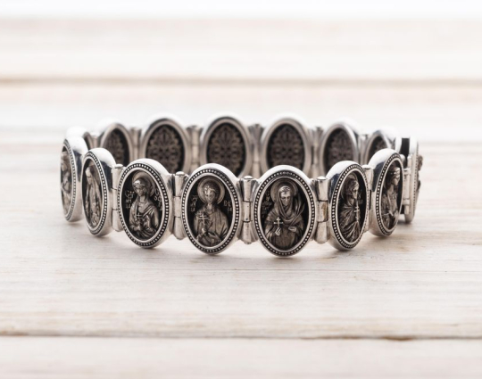 Женский браслет, в каждом звене которого изображены Святые жены. Они подобраны для этого изделия неспроста, ведь согласна Богу, миссия женщин - быть хранительницами дома, своего очага. А Святые помогают им в этом, дарят женщинам свою силу, мудрость через молитвы, обращенные к ним.