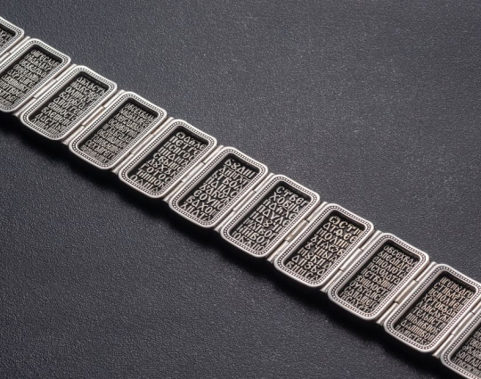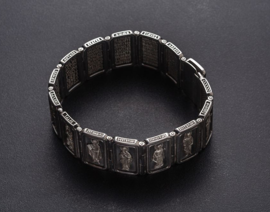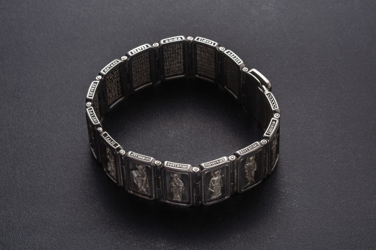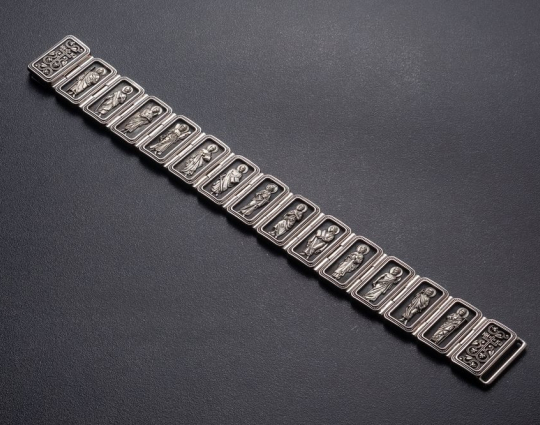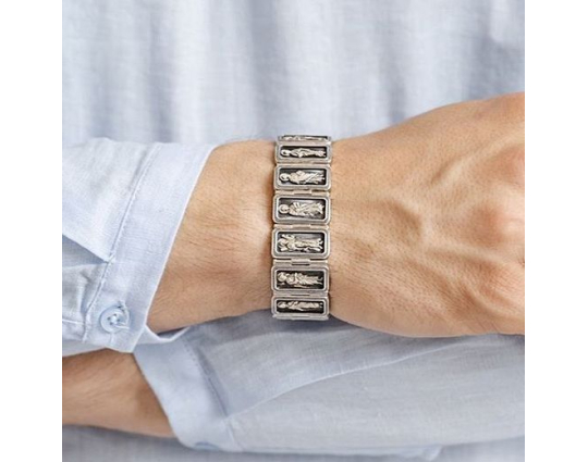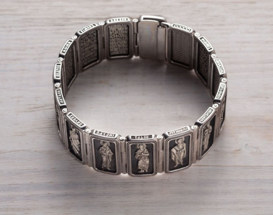 Массивный серебряный браслет с родиевым покрытием, которое позволяет защитить изделие от вредных воздействий окружающей среды и сохранить их первозданный блеск. В каждом звене браслета размещены изображения Апостолов. Они были учениками Иисуса и его посланниками. Он избрал их для служения людям, наделив чудесными способностями. Они помогают просящим в сложных ситуациях, охраняют от опасностей и душевных искушений.