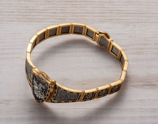 Массивный эффектный браслет, на центральном звене которого изображен Святой Георгий во время свершения его знаменитого подвига: спасение принцессы от змея. Притом, считается, что принцесса символизирует душу человека, а змей - дьявола-искусителя. Победа Георгия означает то, что душа спасена от гибели.