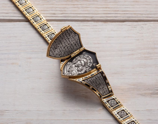 На двух соседних звеньях написана молитва. Остальные звенья украшены знаком Христа- Хризмой. Также браслет украшает прочный замок.