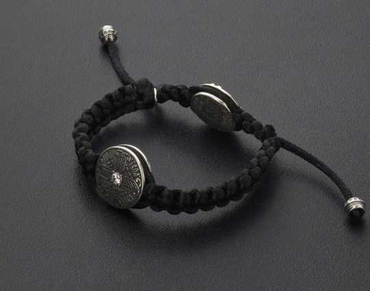 Браслет выполнен из шёлка, бусины - из серебра с чернением. Диаметр одной из них 17 мм, второй - 19 мм.