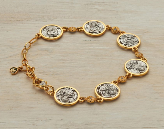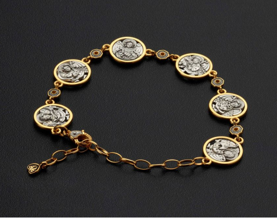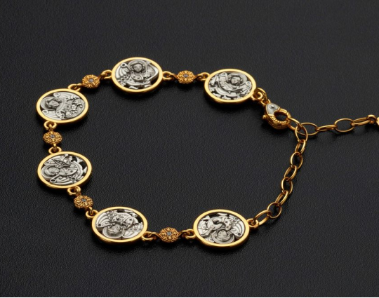 Православный браслет из серебра 925 пробы с православными символами. На звеньях размещены изображения ангелочков. Все они выполнены в разном стиле.