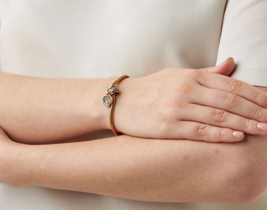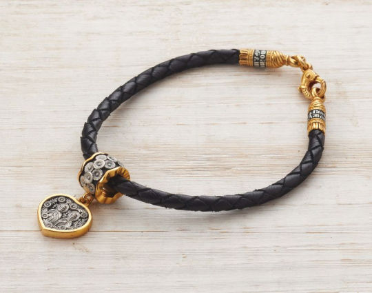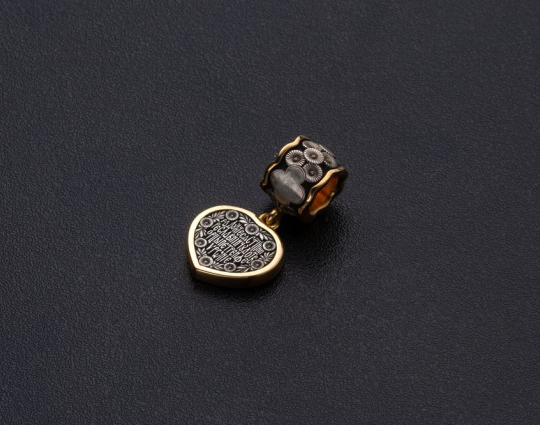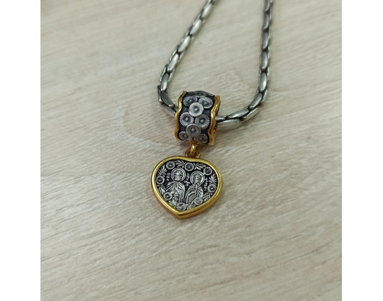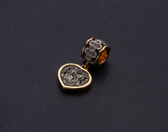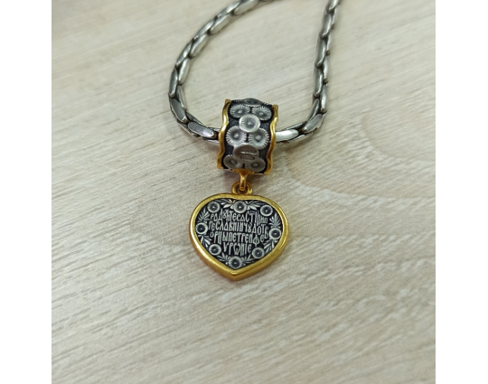 Серебряная подвеска с образами Святых Петра и Февронии. Она выполнена в виде сердца, украшенного цветами. Это символ духовной красоты и верности супругов. Петр и Феврония прославились преданностью, настоящей и взаимной любовью, являются примером сохранения брака. К ним обращаются для обретения мира в семье, укрепления семейных уз и достижения счастья и благополучия.