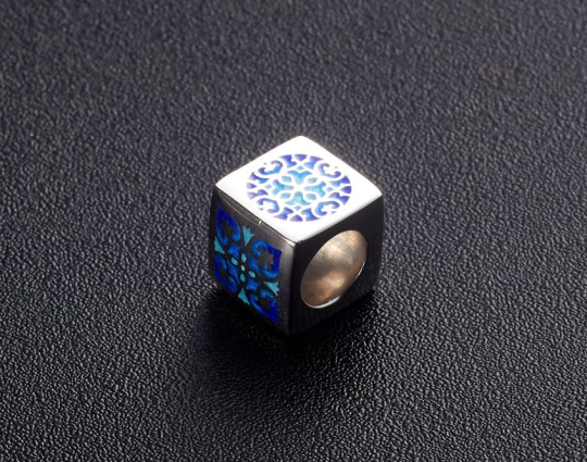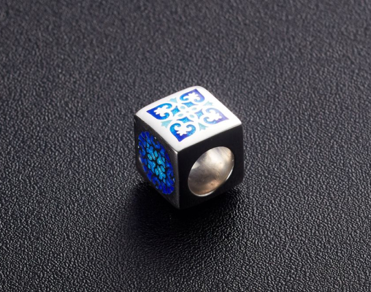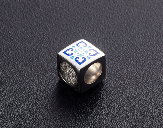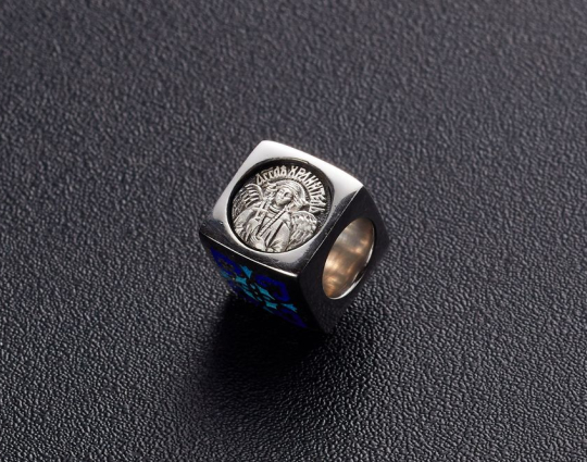 Квадратная бусина из серебра с родиевым покрытием и эмалевой росписью. На одной из сторон – изображение Ангела –Хранителя. Ангел появляется рядом с каждым человеком после Крещения. Он охраняет, наставляет и направляет. Защищает душу человека от злых духов и тяжких грехов.