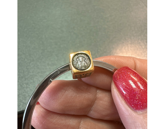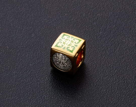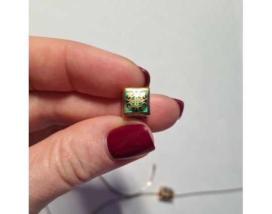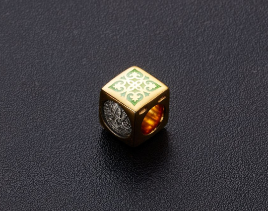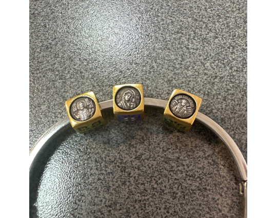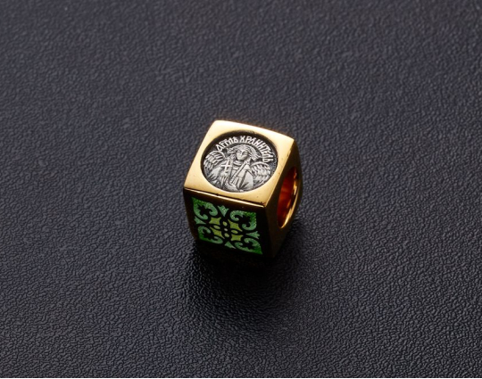 Квадратная бусина из серебра с позолотой и эмалевой росписью. На одной из сторон – изображение Ангела –Хранителя. Ангел появляется рядом с каждым человеком после Крещения. Он охраняет, наставляет и направляет. Защищает душу человека от злых духов и тяжких грехов.