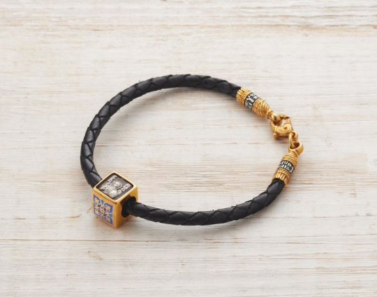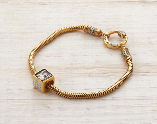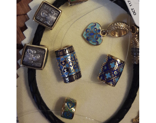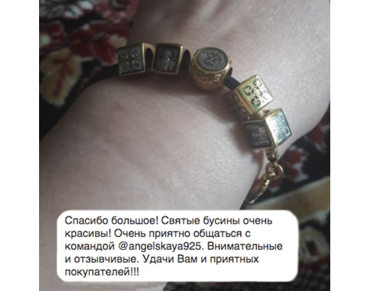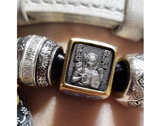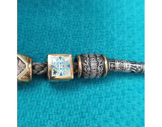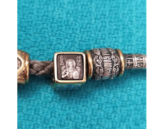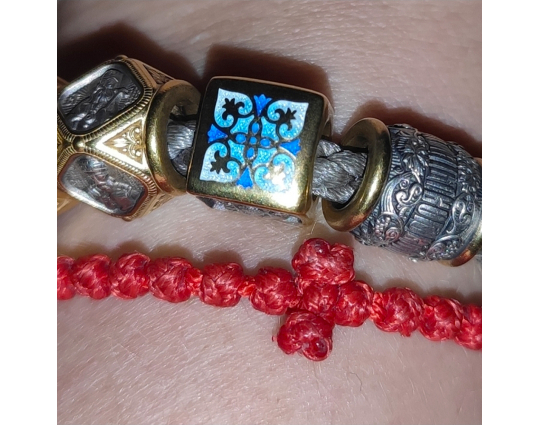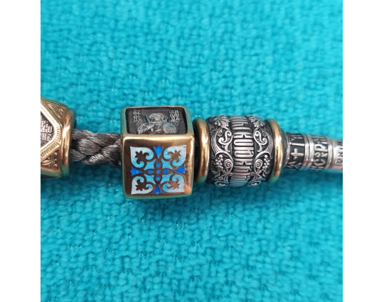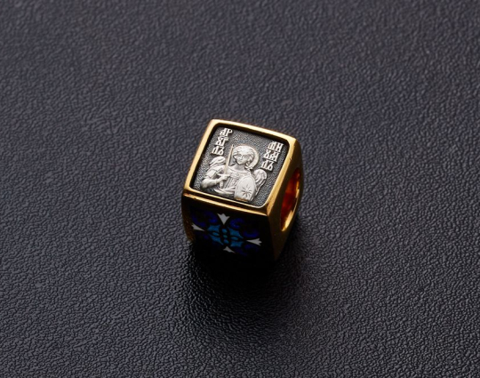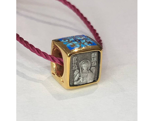 Квадратная бусина из серебра с позолотой и эмалевой росписью. На одной из сторон – изображение Архангела Михаила с крестом и мечом в руках, который защищает душу человека от злых духов и тяжких грехов.
