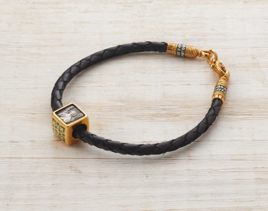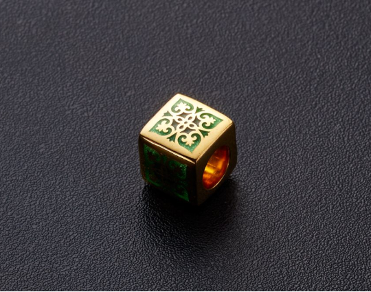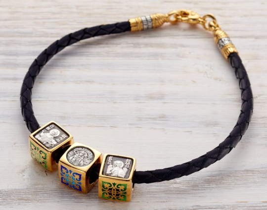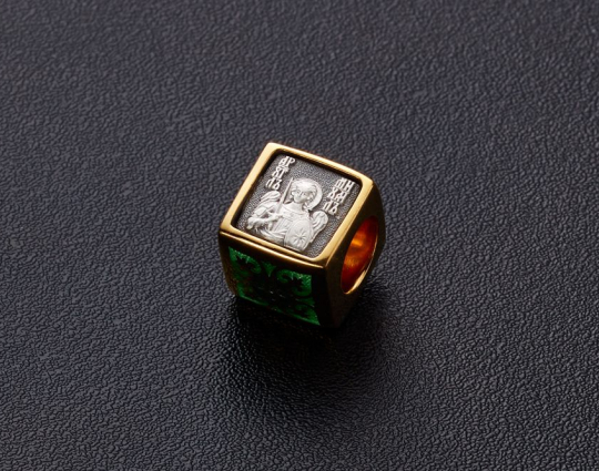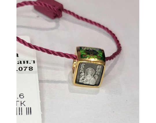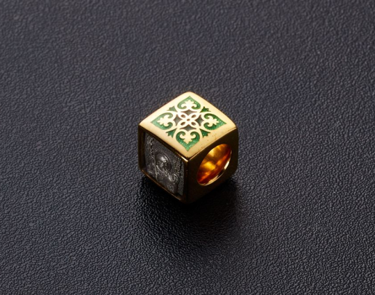 Квадратная бусина из серебра с позолотой и эмалевой росписью. На одной из сторон – изображение Архангела Михаила с крестом и мечом в руках, который защищает душу человека от злых духов и тяжких грехов.