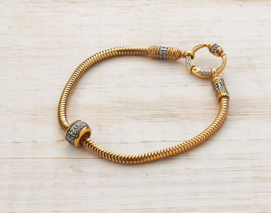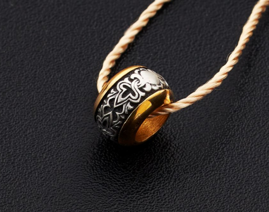 Серебряная бусина, украшенная позолотой и Хризмой, которая является древнейшим символом Иисуса Христа. Она состоит из первых двух бук его имени на греческом языке.