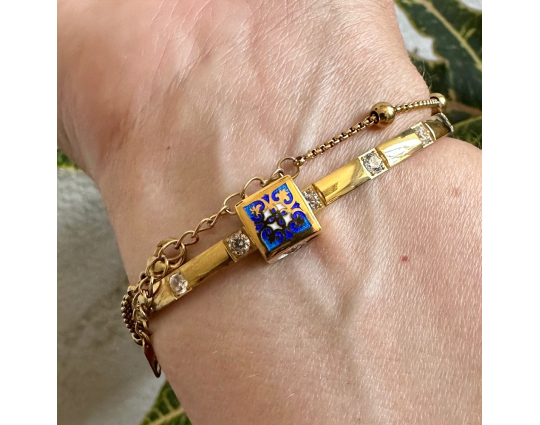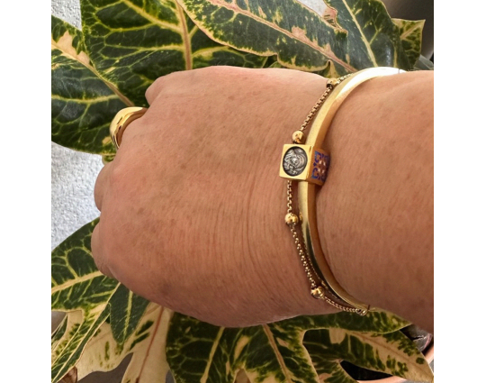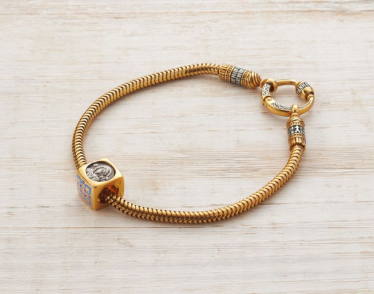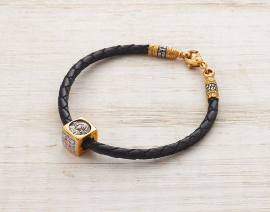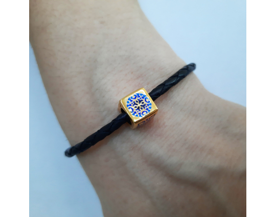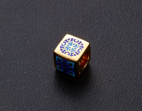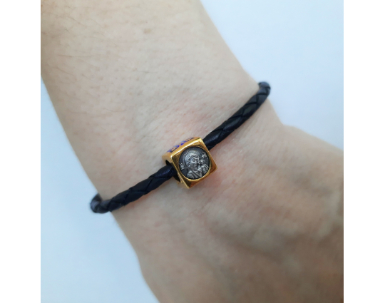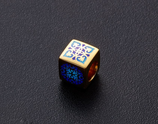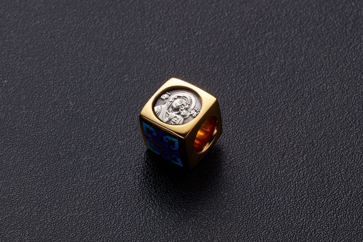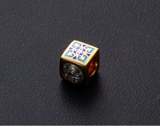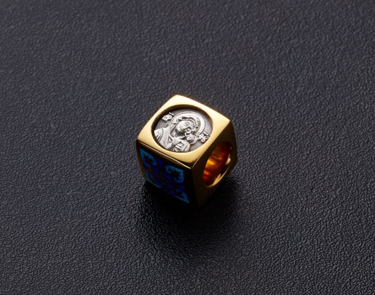 Квадратная бусина из серебра с позолотой и эмалевой росписью. На одной из сторон –  икона «Казанской Божией Матери». У нее просят покровительства как в делах семейных, так и исцеления от болезней. Да сих пор продолжают случаться чудеса с ее помощью.