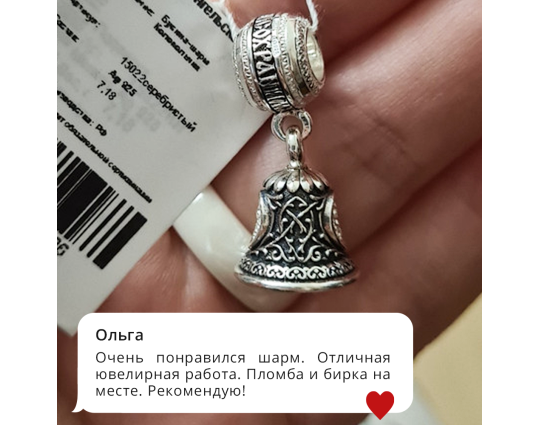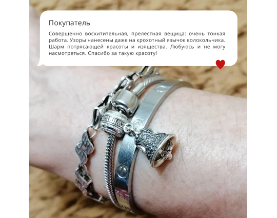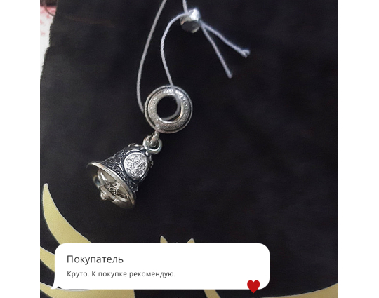Приобрела себе отличнейший колокольчик! На браслете смотрится великолепно, с большого расстояния видна гравировка молитвы. Работа качественная, вживую выглядит просто божественно! Спасибо Вам большое!