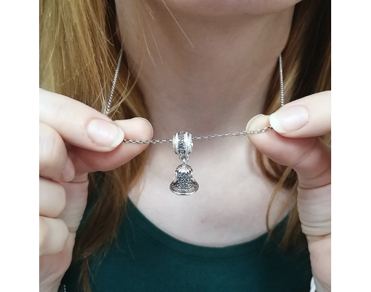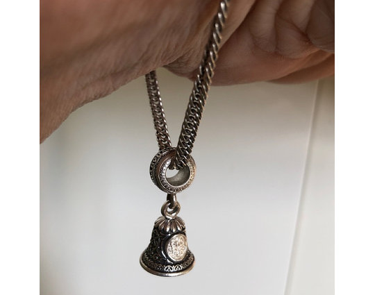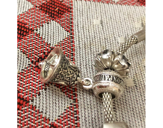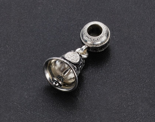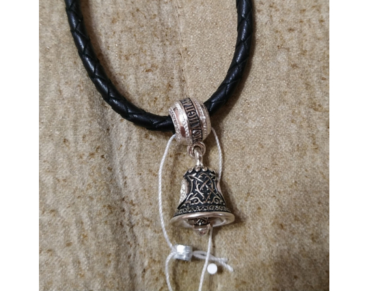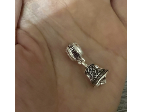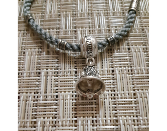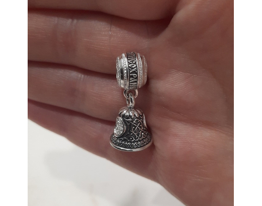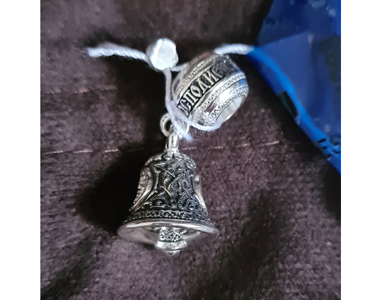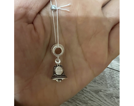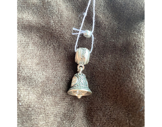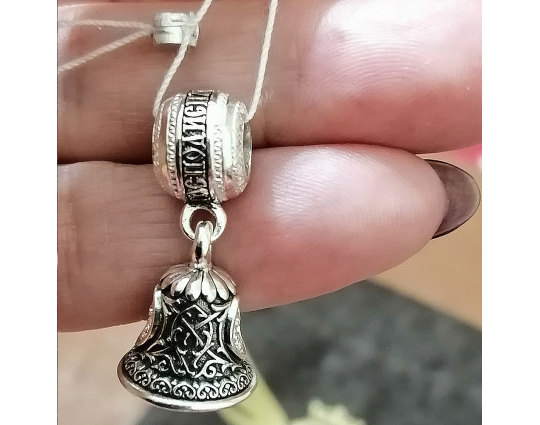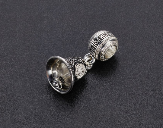 Серебряная бусина, на которой написаны слова-обращения к Богу, украшенная позолоченной отделкой и подвесом в виде небольшого колокольчика. На колокольчик нанесен резной орнамент.