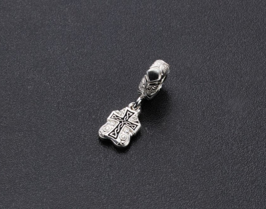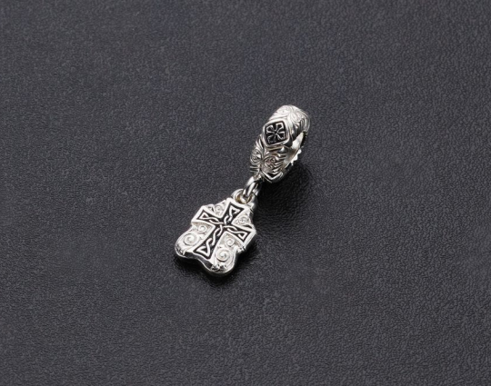 Подвеска из серебра в форме креста, которая крепится на кольцо. Сама подвеска украшена узором в виде растительных элементов, означающих рождение новой, райской жизни.