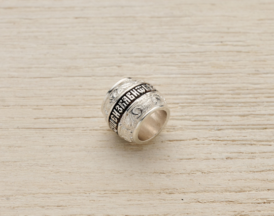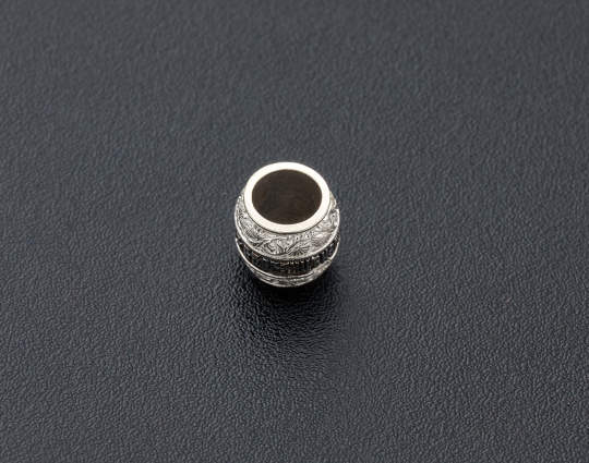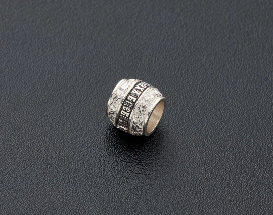 Серебряная бусина, украшенная растительным орнаментом, который состоит из цветков гвоздики. Эти цветки с древних времен символизировали материнскую любовь и слезы Богоматери, которые она проливала о своем сыне.