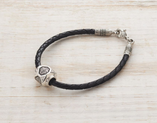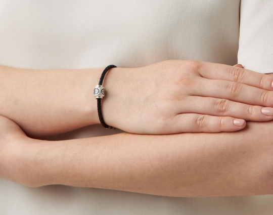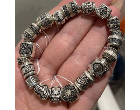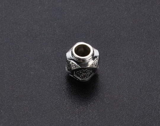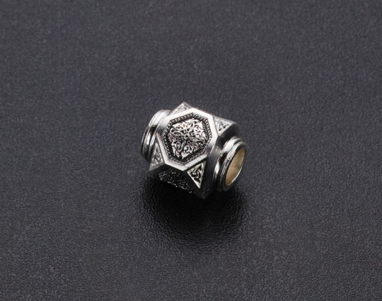 Серебряная бусина необычной формы, на гранях которой нарисован равносторонний крест, складывающийся из побегов растения аканта, что одновременно символизирует и силу человеческого духа, и победу добра над злом, жизни над смертью, и духовное процветание.