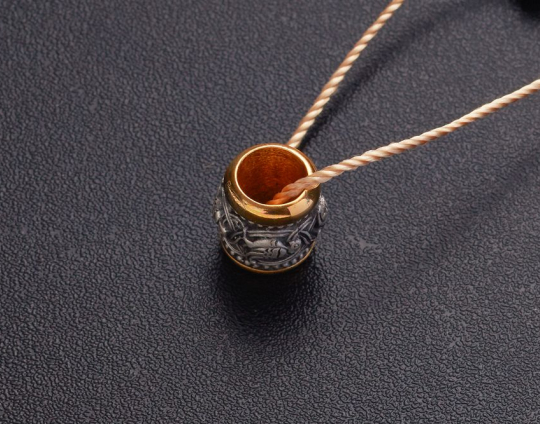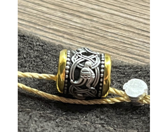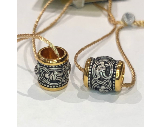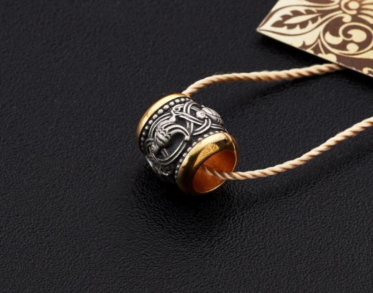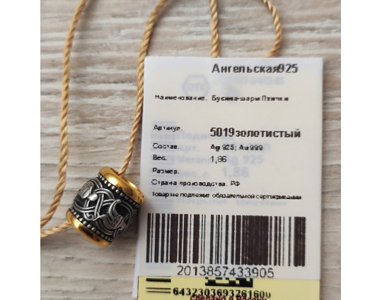 Серебряная бусина с позолоченной отделкой и орнаментом в виде птиц, которые символизируют души верующих, попавших в Небесное царство. О тех, кто попал в Небесное царство, можно сказать, что это спасенные души.