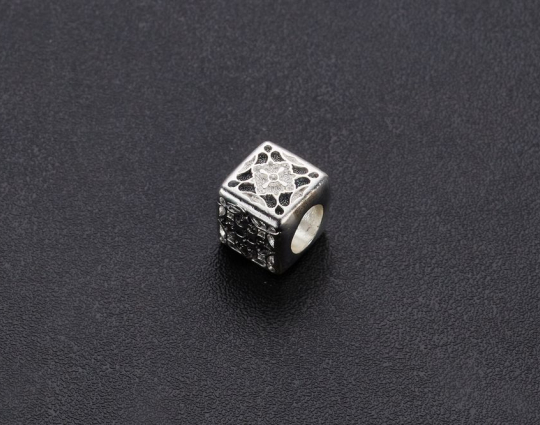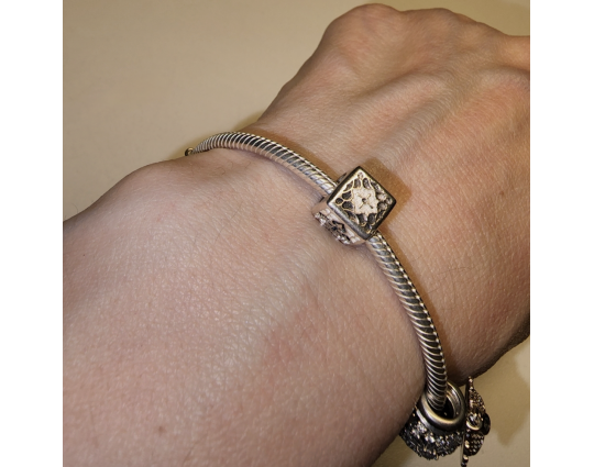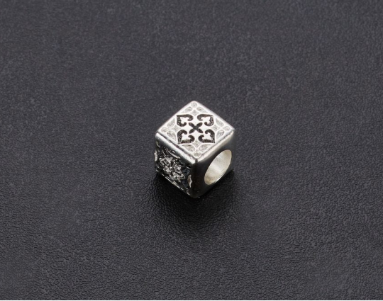 Квадратная бусина с орнаментом в виде равностороннего креста. Такой крест - символ победы и процветания. Вокруг креста - лилии, которые считаются самыми чистыми, непорочными цветами. У всех верующих они ассоциируются с Девой Марией.