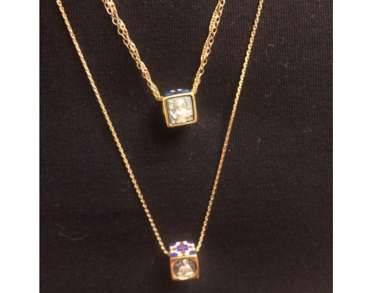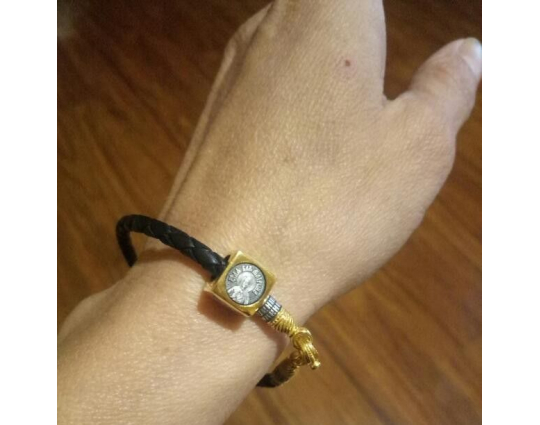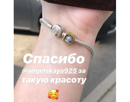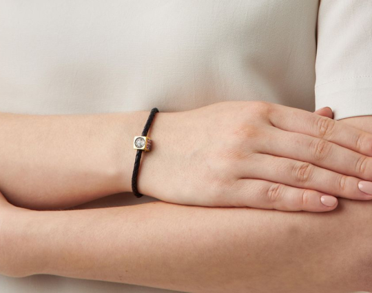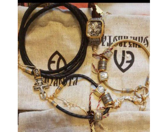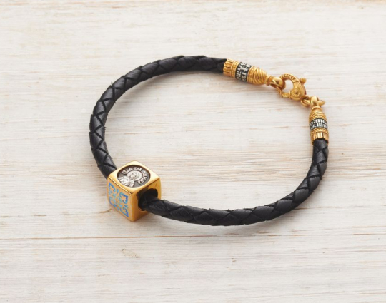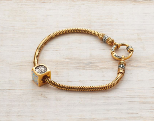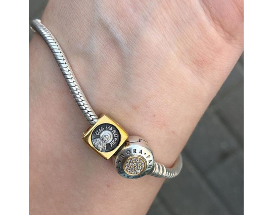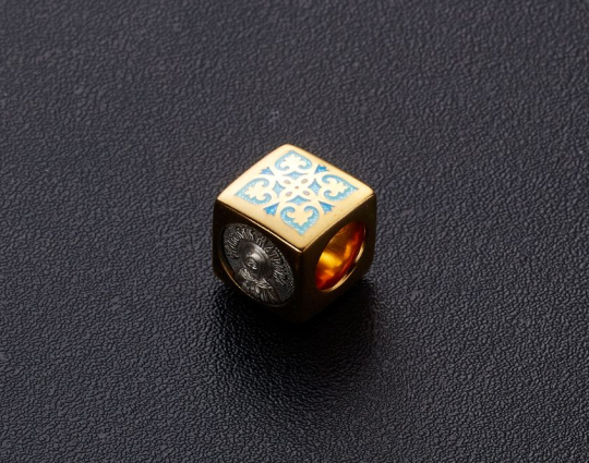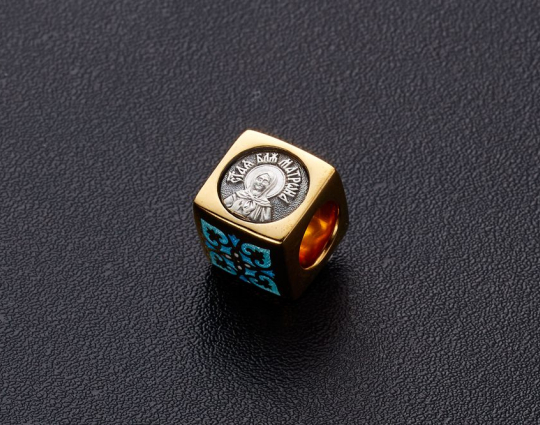 Квадратная бусина из серебра с позолотой и эмалевой росписью. На одной из сторон – образ «Святой Блаженной Матроны Московской». У нее просят покровительства как в делах семейных, так и исцеления от болезней. До сих пор продолжают случаться чудеса с ее помощью.