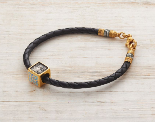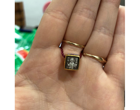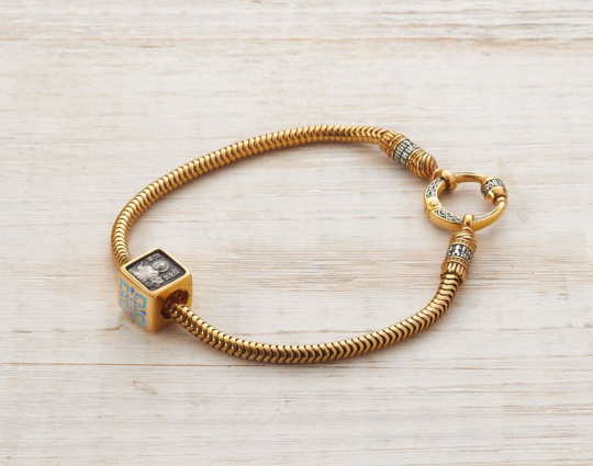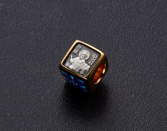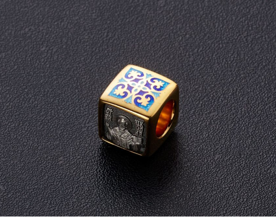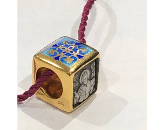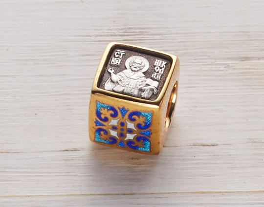 Квадратная бусина из серебра с позолотой и эмалевой росписью. На одной из сторон - изображение Святого Николая. У него просят помощи военные, путешественники и простые люди. Николай Чудотворец исцеляет, оберегает и защищает.