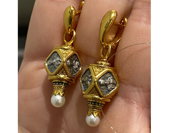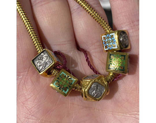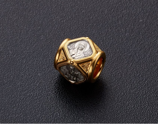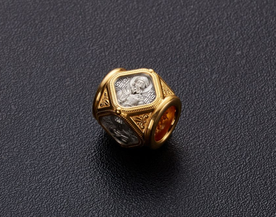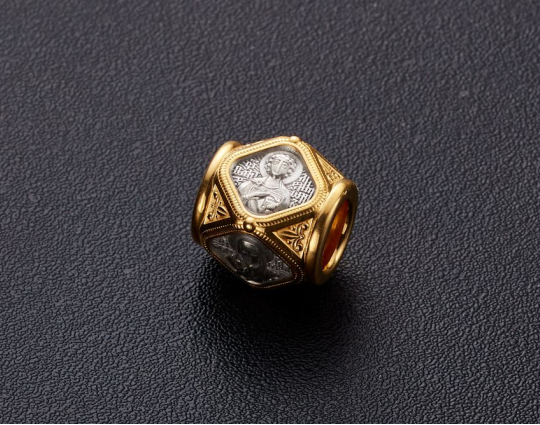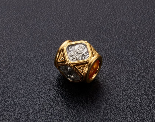 Серебряная бусина с гранями, каждая из которых имеет изображением Святого. Вокруг - позолота и растительный орнамент.