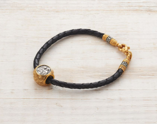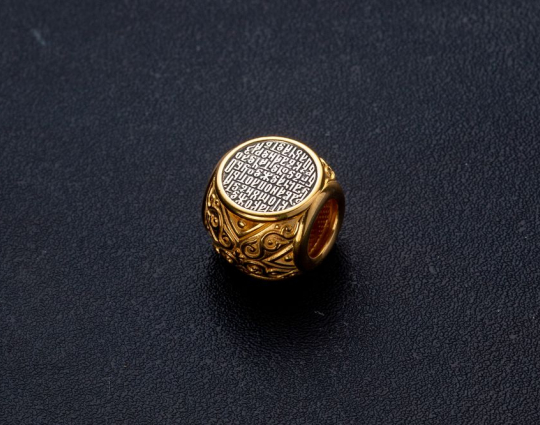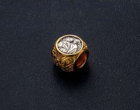 Бусина из серебра,  отделанная позолотой. На одной из сторон – изображение Святых Петра и Февроньи. Святые супруги прославились преданностью взаимной любви и являются примером сохранения брака в настоящее время. Этим святым молятся о мире в семье, укреплении семейных уз и достижения семейного счастья и благополучия.