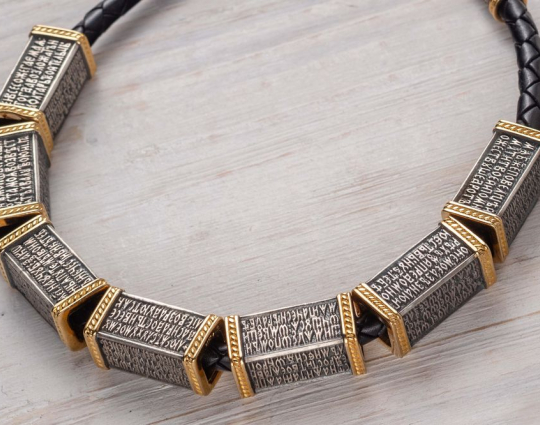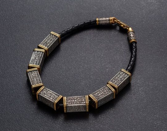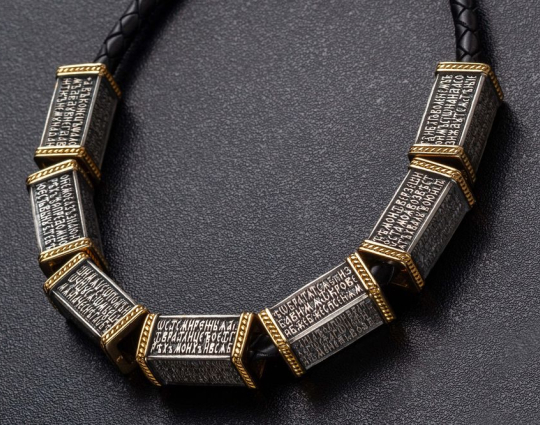 На каждой бусине написана часть текста из Псалма 50, который называется также покаянным. Он носит такое название, потому что в нем выражено и глубокое сожаление о сделанном, и сильнейшая молитва с просьбой о помиловании.