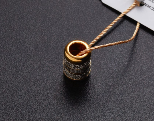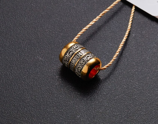 Серебряная бусина с позолотой и молитвой на черненом корпусе. В молитве содержатся такие слова, которые позволяют одновременно обращаться к Богу и просить его о покаянии, помиловании.