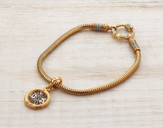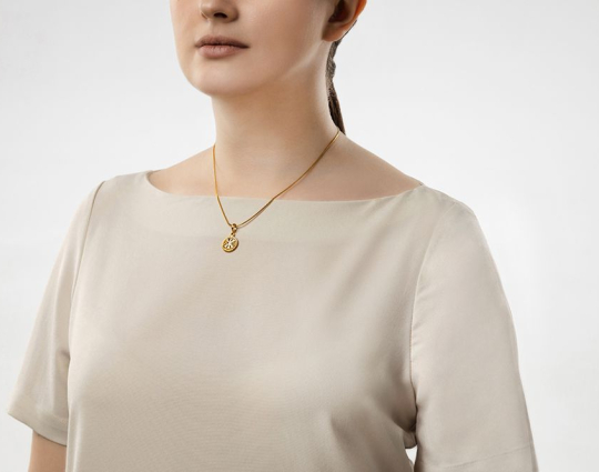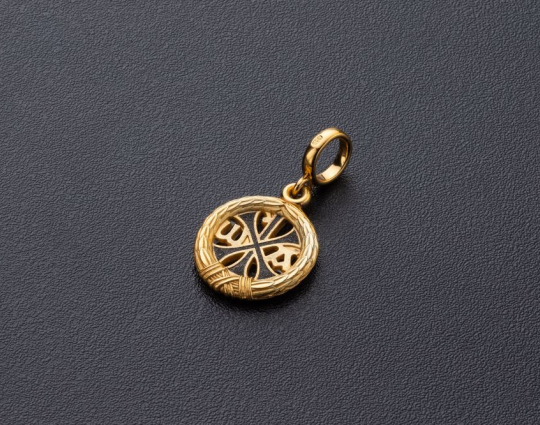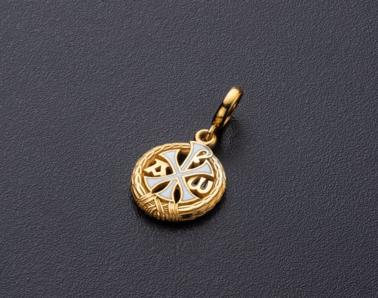 Подвеска из серебра с позолотой. На ней изображена Хризма - монограмма имени Христа, которая состоит из двух начальных греческих букв имени. По бокам изображены две буква - Альфа и Омега, символизирующие начало и конец.