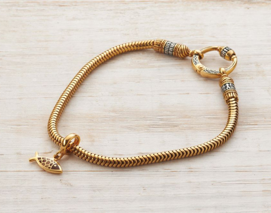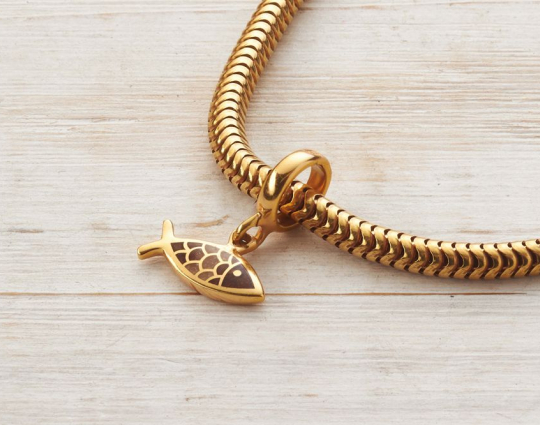 Серебряная бусина в виде рыбки - древнейшего символического обозначения Христа. Так Его изображали первые христиане. Кроме того, с рыбами связывают учеников Иисуса и просветителей, которые были рыбаками и «вылавливали» человеческие души из морских пучин.
