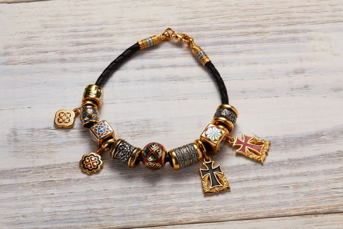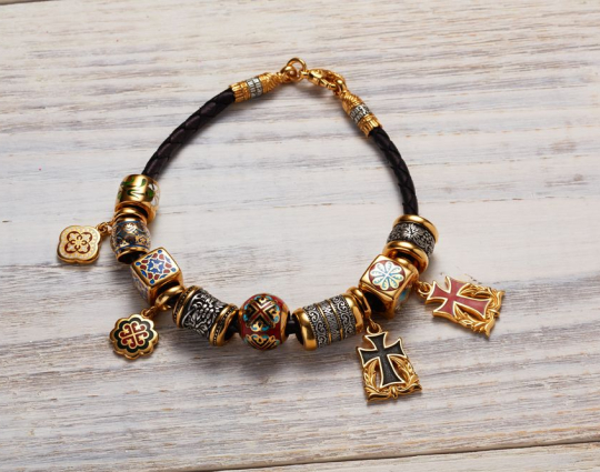 Набор бусин включает в себя: бусина «Гвоздика», подвес «Греческий крест». Эмаль, бусина, бусина, подвес «Трилистник». Эмаль, бусина «Виноградная лоза», бусина. Эмаль, бусина «Иисусова молитва», подвеска, бусина «Ангел-Хранитель», подвес «Процветший крест», бусина «Виноградная лоза».