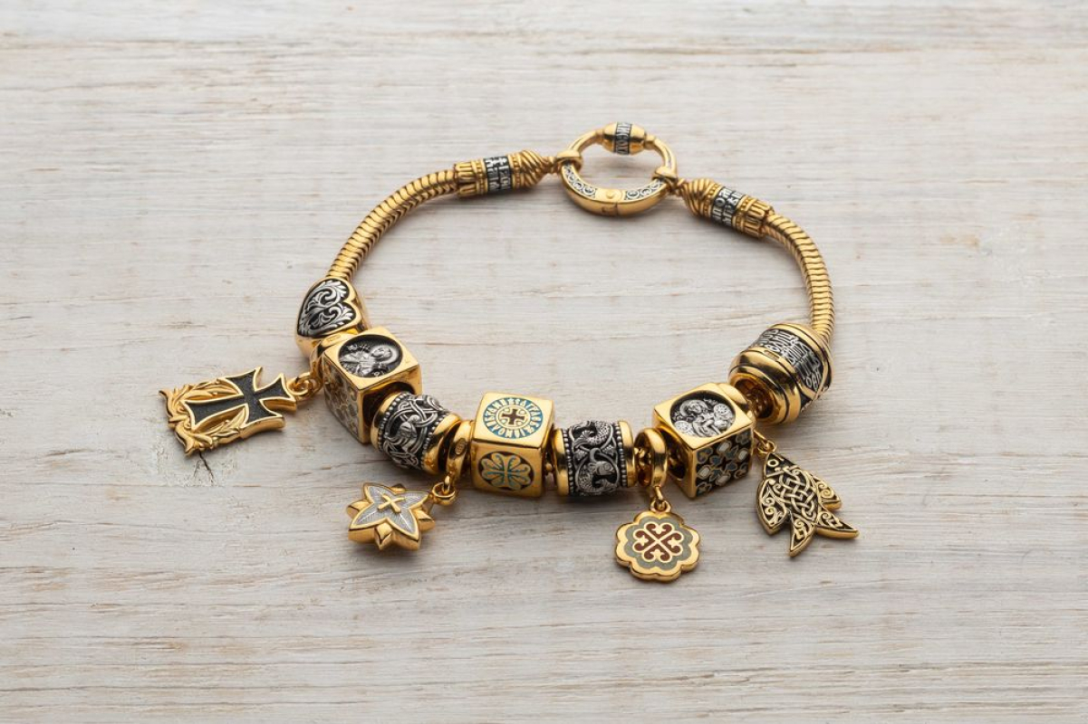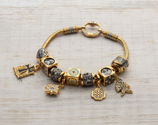 Набор бусин включает в себя: бусина «Икона Божией матери «Семистрельная»», бусина "Сердце", бусина "Вьюнок", подвеска "Крест", подвеска "Вифлеемская звезда", подвеска "Рыбка", подвеска "Трилистник" с эмалью, бусина "Птички", бусина "Рыбки", 2 бусины с Ангелом - Хранителем.