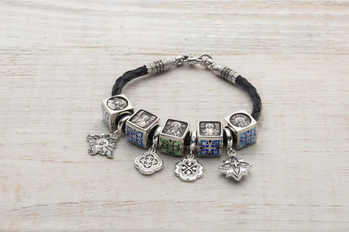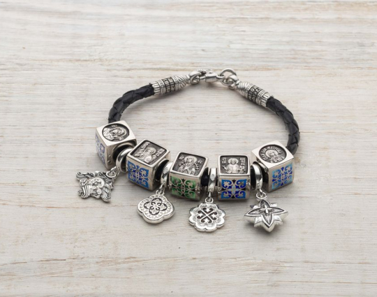 Набор включает в себя подвески с православными символами и бусины с образами Святых. Бусины украшены эмалью синего и зеленого цвета. На них изображены Казанская икона Богородицы, Образ "Умягчение злых сердец", Архангел Михаил, образ Николая Чудотворца, Святой Преподобной Матроны Московской.