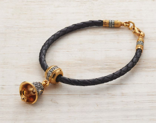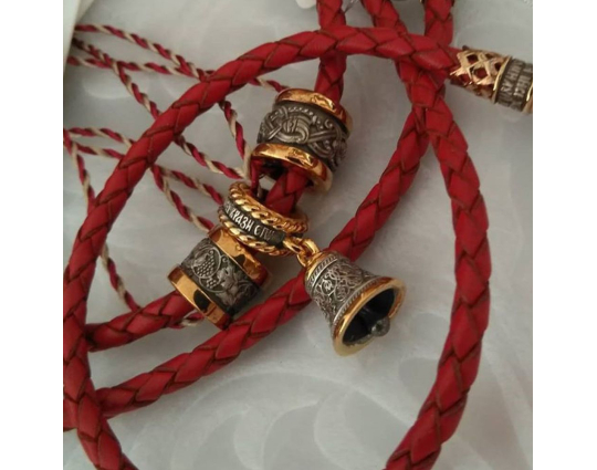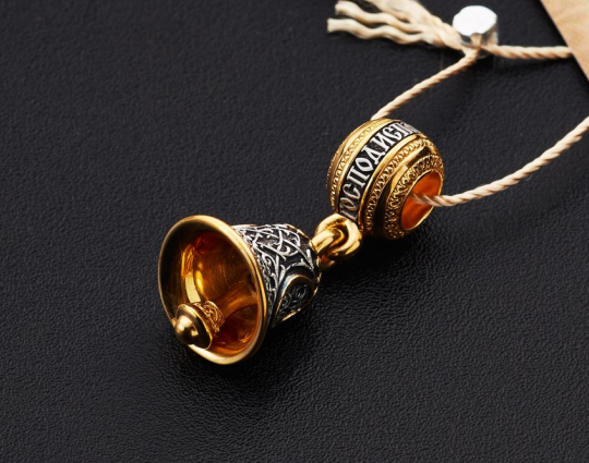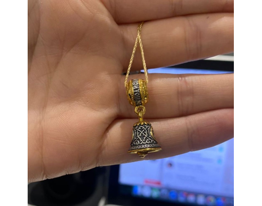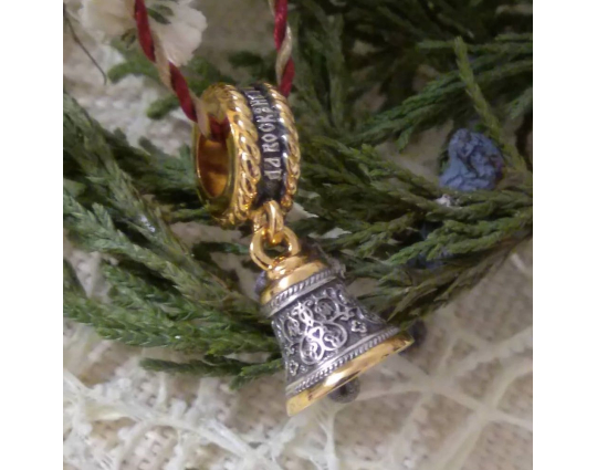 Серебряная бусина, на которой написаны слова-обращения к Богу, украшенная позолоченной отделкой и подвесом в виде небольшого колокольчика. На колокольчик нанесен резной орнамент.