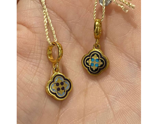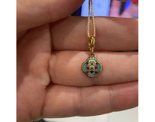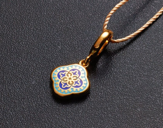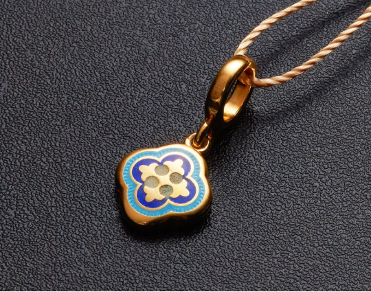 Серебряная подвеска изящной, округлой формы, которая украшена позолотой и эмалевой росписью. В ее центре - равносторонний крест. Такой крест - символ победы и процветания, а равная длина его планок означает равенство небесного и земного мира.