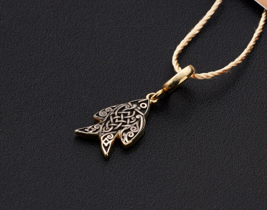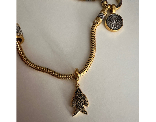 Серебряная бусина в виде рыбы, которая является древнейшим символическим обозначением Христа. Так Его изображали первые христиане. Кроме того, с рыбами связывают учеников Иисуса и просветителей, которые были рыбаками и «вылавливали» человеческие души из морских пучин.