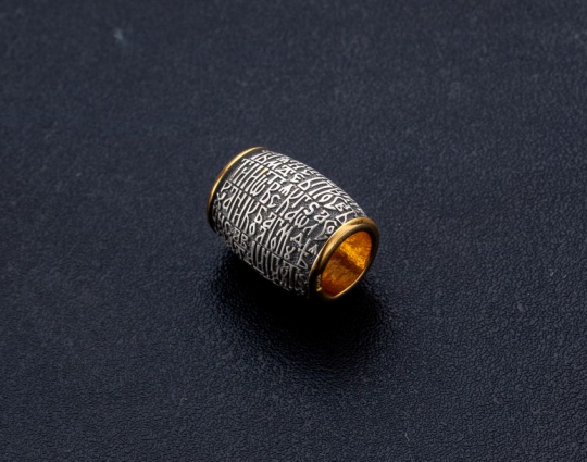 Серебряная бусина с позолотой,  на корпус которой нанесены слова-обращения к Ангелу-Хранителю. Эти слова -  просьба о помощи, защите и покровительстве,  ведь Ангел не может действовать на свое усмотрение, его нужно об этом просить. Читать эту молитву стоит ежедневно.