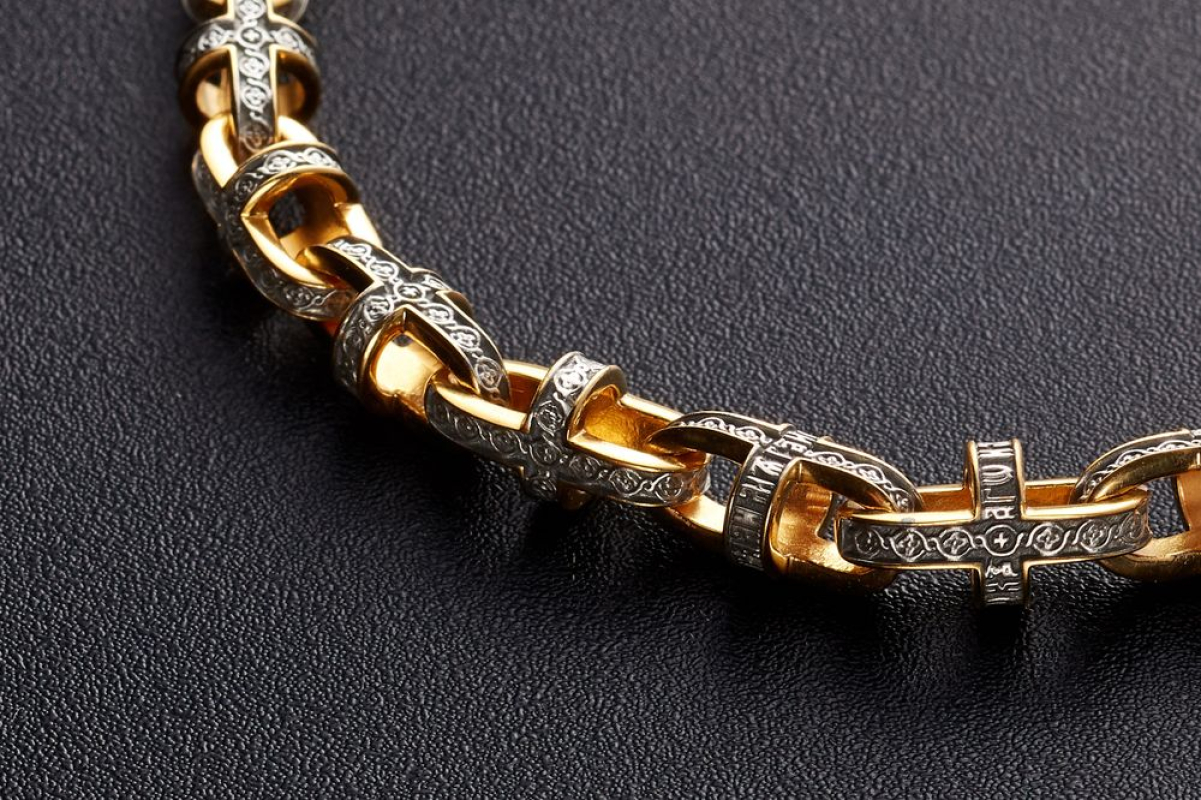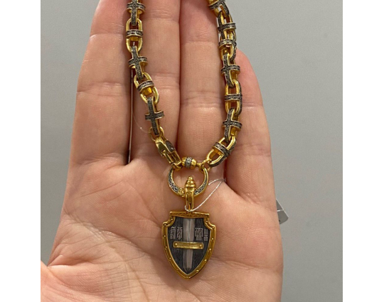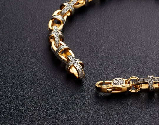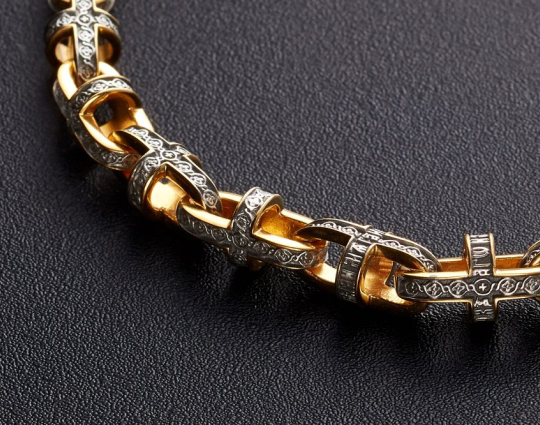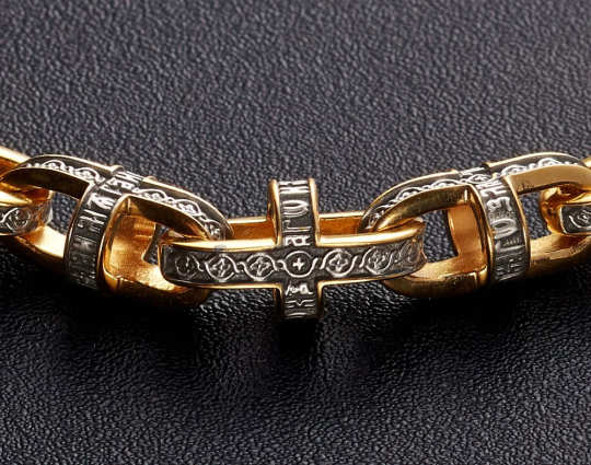 Серебряная цепь с позолоченной отделкой и объемными звеньями, которые украшены изящным византийским узором. В центре узор- Георгиевский крест, символизирующий веру и преданность Иисусу.