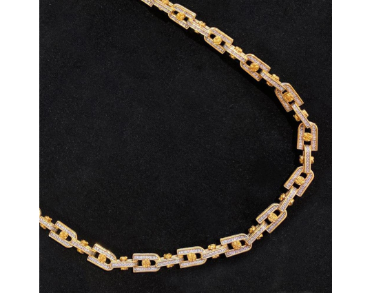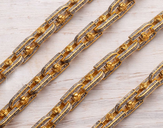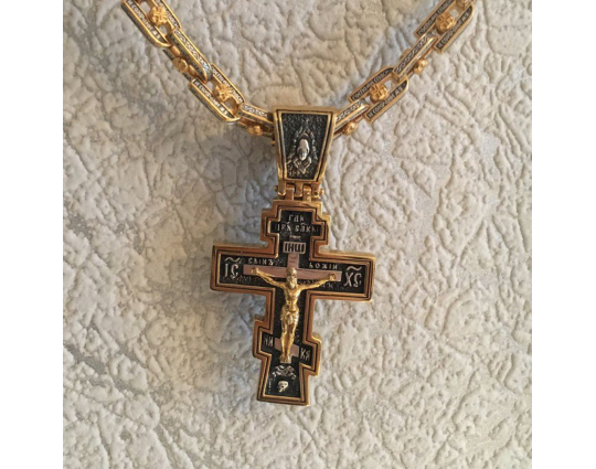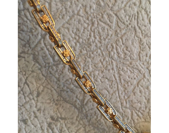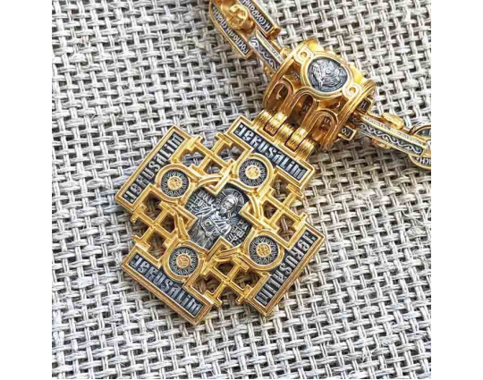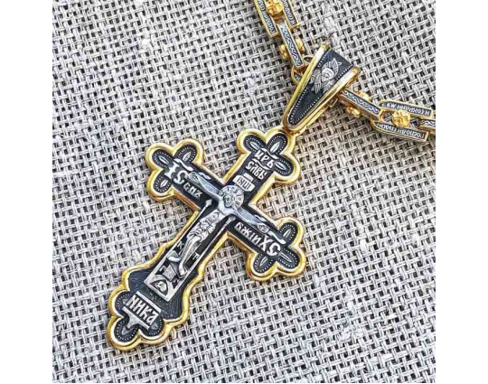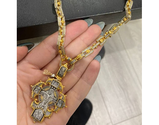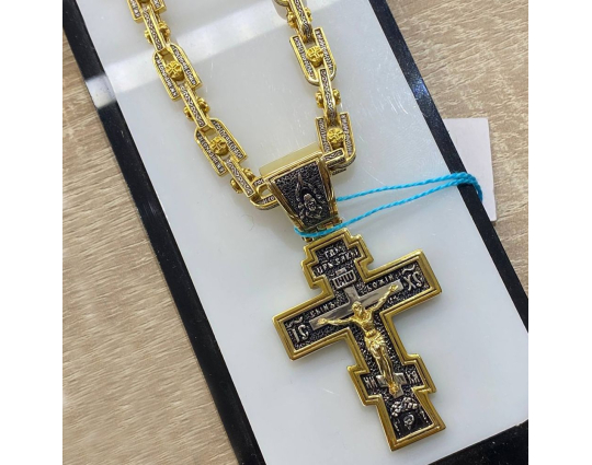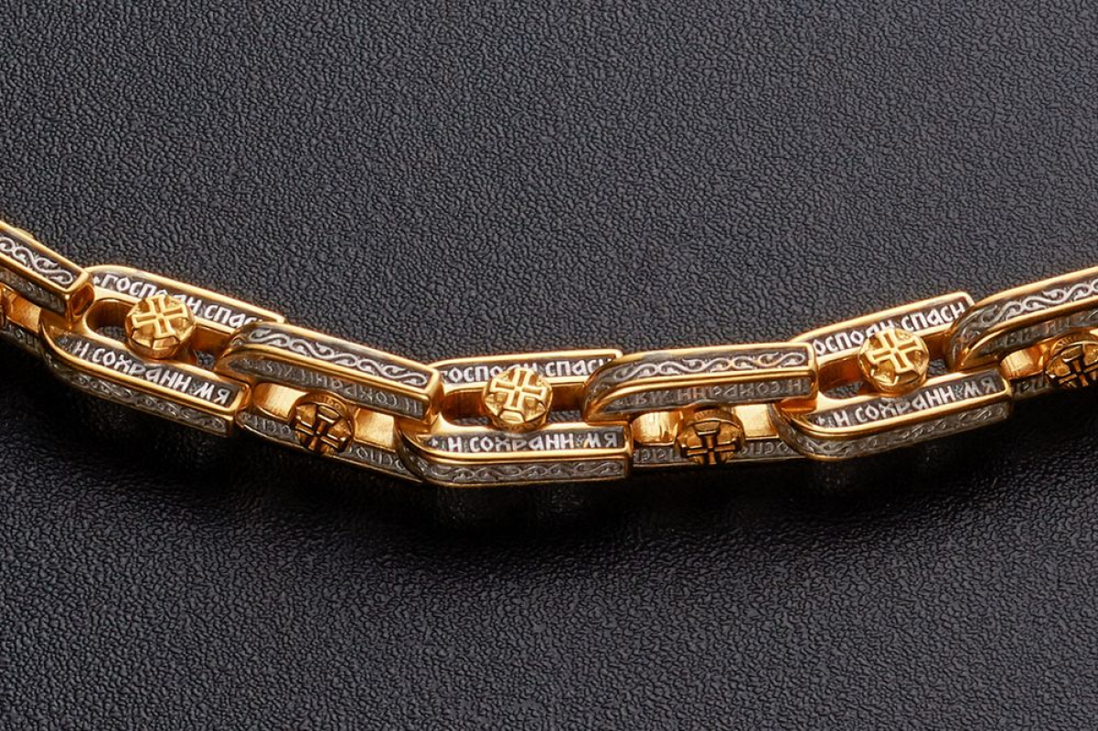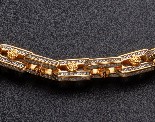 Серебряная цепь с позолоченной отделкой, состоящая из объемных звеньев в виде подков. В них вставлена вращающаяся вставка - Крест. По звену идет молитва "Господи, спаси и сохрани мя", которой просят у Всевышнего защиты и помощи.
