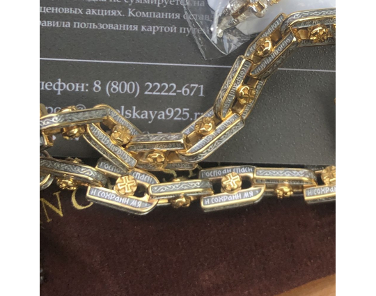 Получили цепь и подвеску (подарок). Все красиво, живьем так же, как и на видео. Мужу отлично подошла, с размером все в порядке. Звенья не обычной формы, не обычная вещь. "Спаси и сохрани" на каждом звене написано разборчиво и четко. Спасибо большое за не простые украшения!